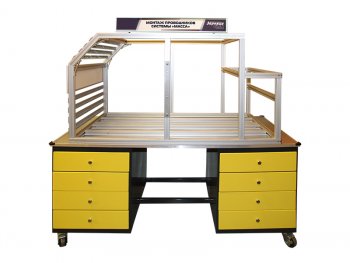 Стенд выполнен из конструкционного анодированного алюминиевого профиля сечением 40 х 40 мм с пазами 10 мм в виде каркаса автомобиля. Соединение конструкционных элементов каркаса разборное болтовое. Открытые концы профилей защищены торцевыми пластиковыми заглушками. Установка может быть изготовлена по индивидуальному заказу с учетом специфики обучения или производственного процесса.